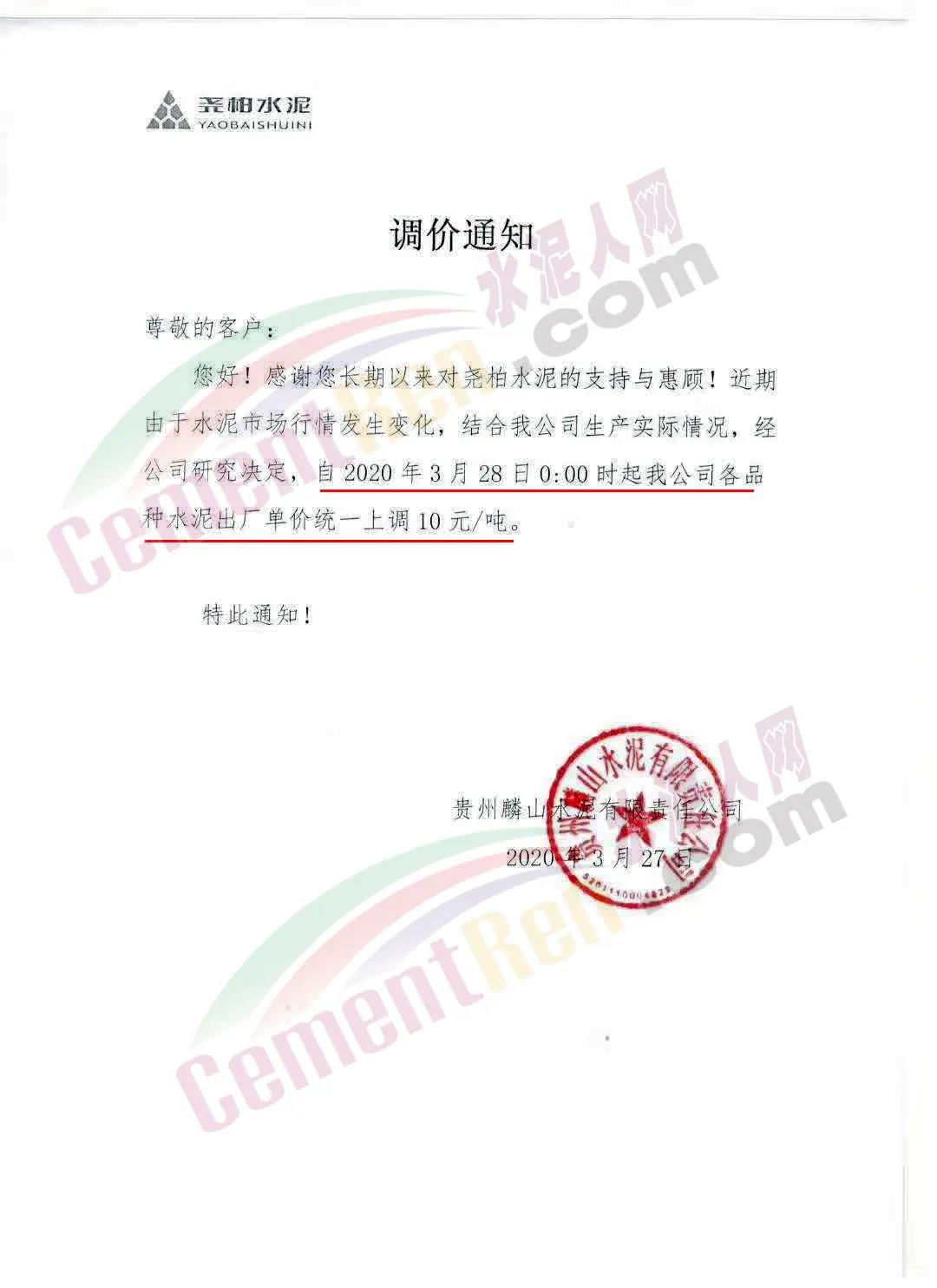 春江水泥通知水泥價格下調(diào)20元/噸。