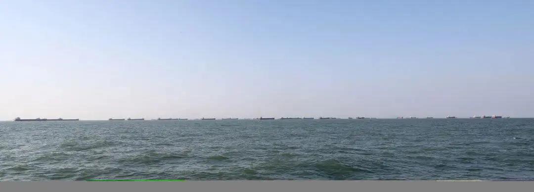 沿海水域,遠(yuǎn)遠(yuǎn)望去,內(nèi)河船連成“一條龍”。