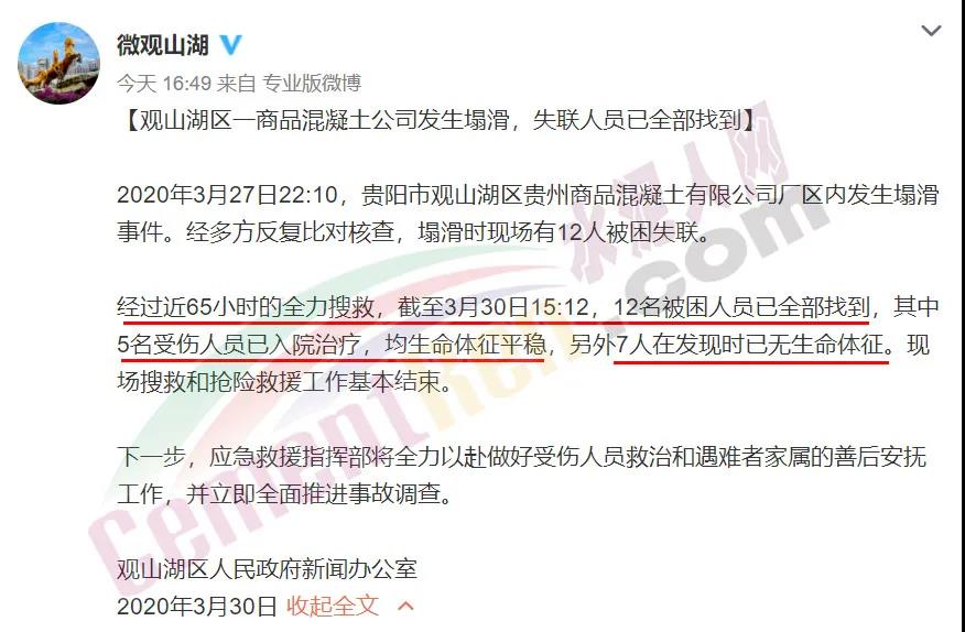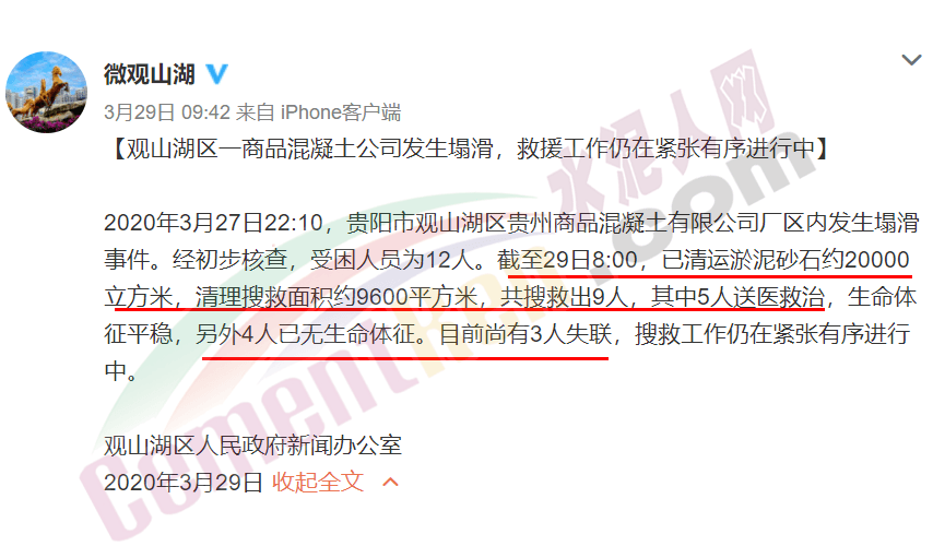 據(jù)貴陽市觀山湖區(qū)委宣傳部官方微博3月30日消息,2020年3月27日22:10,貴陽市觀山湖區(qū)貴州商品混凝土有限公司廠區(qū)內(nèi)發(fā)生塌滑事件。經(jīng)多方反復(fù)比對核查,塌滑時現(xiàn)場有12人被困失聯(lián)。