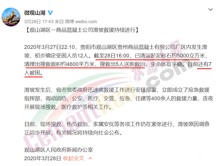 觀山湖區(qū)人民政府新聞辦公室通過該平臺通報稱,經(jīng)過近65小時的全力搜救,截至3月30日15:12,12名被困人員已全部找到,其中5名受傷人員已入院治療,均生命體征平穩(wěn),另外7人在發(fā)現(xiàn)時已無生命體征。