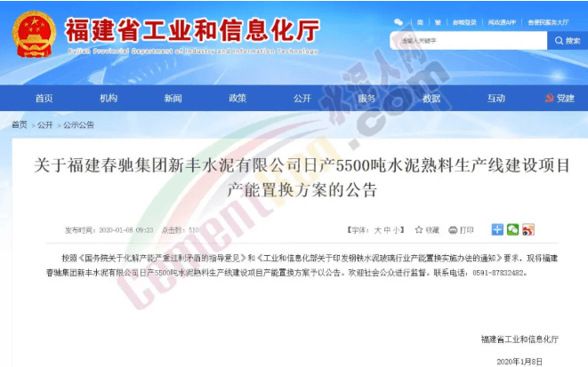 據(jù)水泥人網(wǎng)了解,該項(xiàng)目是一個(gè)產(chǎn)能置換項(xiàng)目,由福建省工業(yè)和信息化廳2019年12月24日公示,2020年1月8日正式公告。