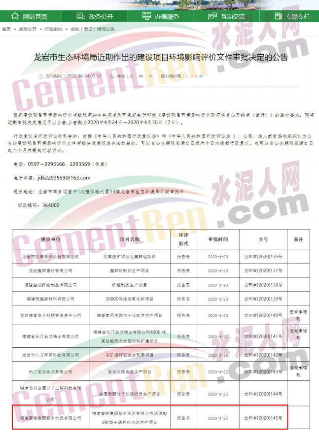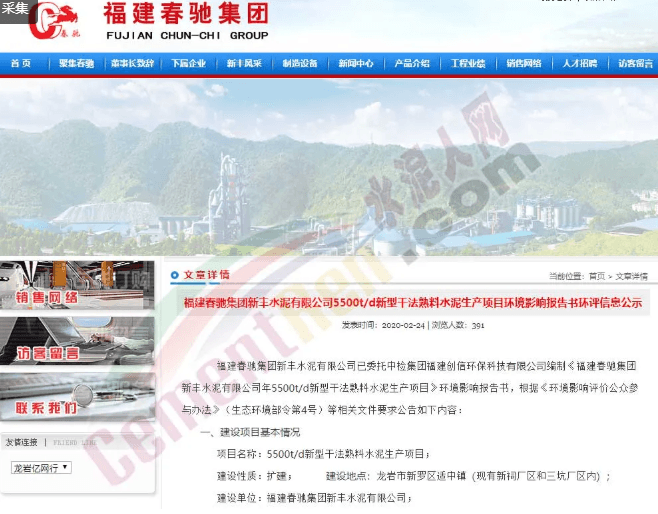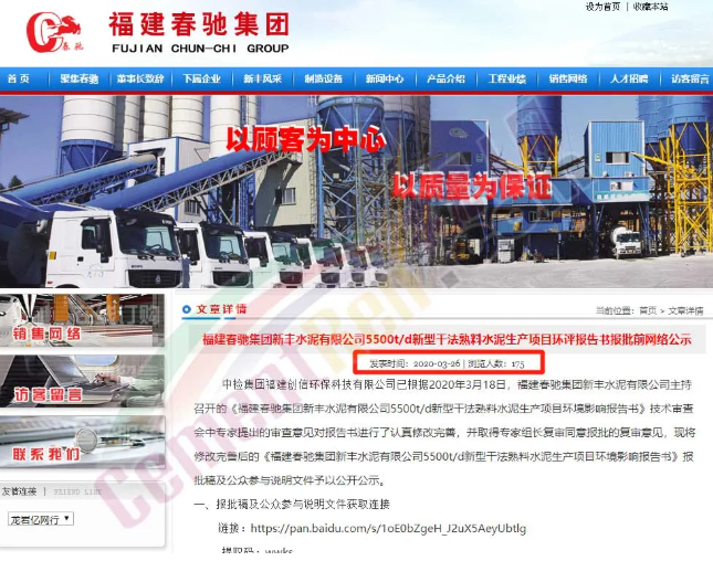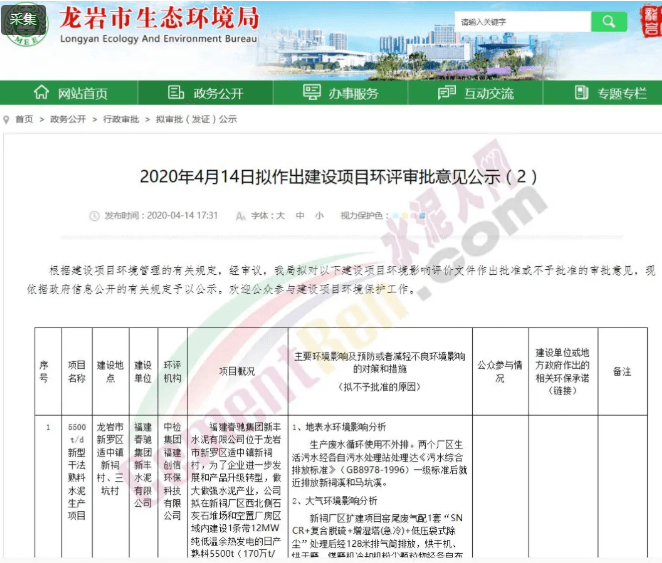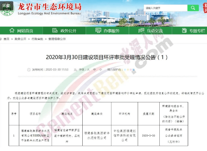 然而,據(jù)龍巖市生態(tài)環(huán)境局公開信息顯示,福建春馳集團(tuán)新豐水泥有限公司5500t/d新型干法熟料水泥生產(chǎn)項(xiàng)目是在3月30日被龍巖市生態(tài)環(huán)境局受理,該項(xiàng)目公示時(shí)間為公示時(shí)間:2020年3月30日—2020年4月13日(10個(gè)工作日)。