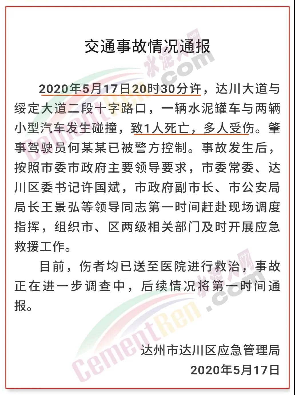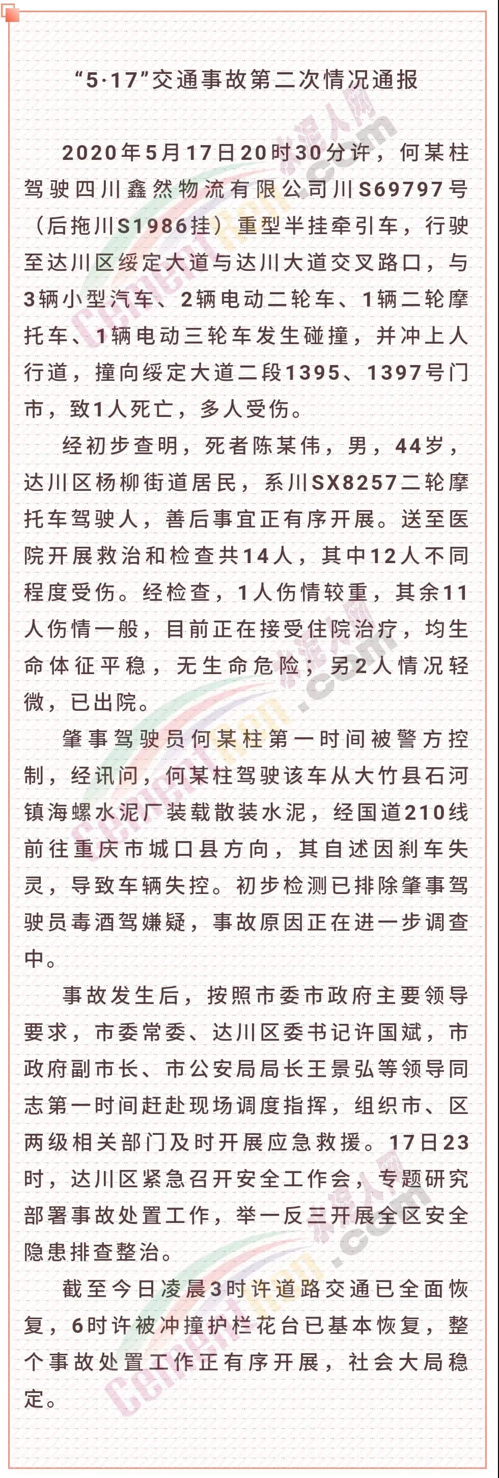 昨日(5月18日)達川區(qū)應急管理局發(fā)布的“5·17”交通事故第二次情況通報稱:2020年5月17日20時30分許,何某柱駕駛四川鑫然物流有限公司川S69797號(后拖川S1986掛)重型半掛牽引車,行駛至達川區(qū)綏定大道與達川大道交叉路口,與3輛小型汽車、2輛電動二輪車、1輛二輪摩托車、1輛電動三輪車發(fā)生碰撞,并沖上人行道,撞向綏定大道二段1395、1397號門市,致1人死亡,多人受傷。經初步查明,死者陳某偉,男,44歲,達川區(qū)楊柳街道居民,系川SX8257二輪摩托車駕駛人,善后事宜正有序開展。送至醫(yī)院開展救治和檢查共14人,其中12人不同程度受傷。經檢查,1人傷情較重,其余11人傷情一般,目前正在接受住院治療,均生命體征平穩(wěn),無生命危險;另2人情況輕微,已出院。肇事駕駛員何某柱第一時間被警方控制,經訊問,何某柱駕駛該車從大竹縣石河鎮(zhèn)海螺水泥廠裝載散裝水泥,經國道210線前往重慶市城口縣方向,其自述因剎車失靈,導致車輛失控。初步檢測已排除肇事駕駛員毒酒駕嫌疑,事故原因正在進一步調查中。