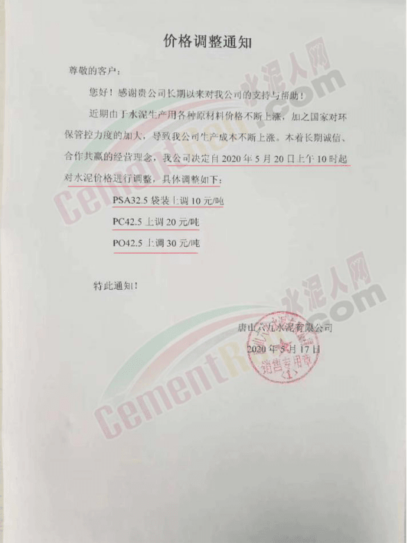5月16日,唐山京東實業(yè)集團有限公司通知,根據(jù)市場變化情況,自2020年5月20日起,P.S.A32.5水泥在原來價格的基礎上,每噸上調(diào)10元,P.O42.5水泥在原來價格的基礎上,每噸上調(diào)30元。
