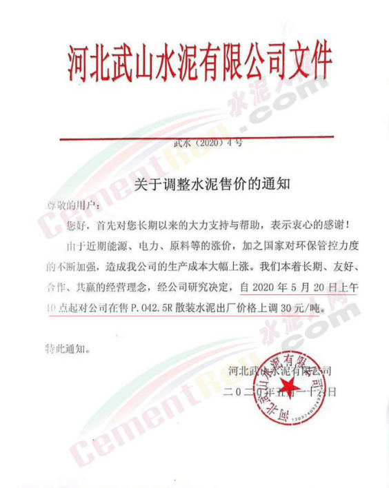 5月16日,河北武山水泥有限公司通知,根據(jù)市場變化情況,能源、電力、原料等的漲價,自2020年5月20日上午10點起,P.042.5R散裝水泥出廠價格上調(diào)30元/噸。