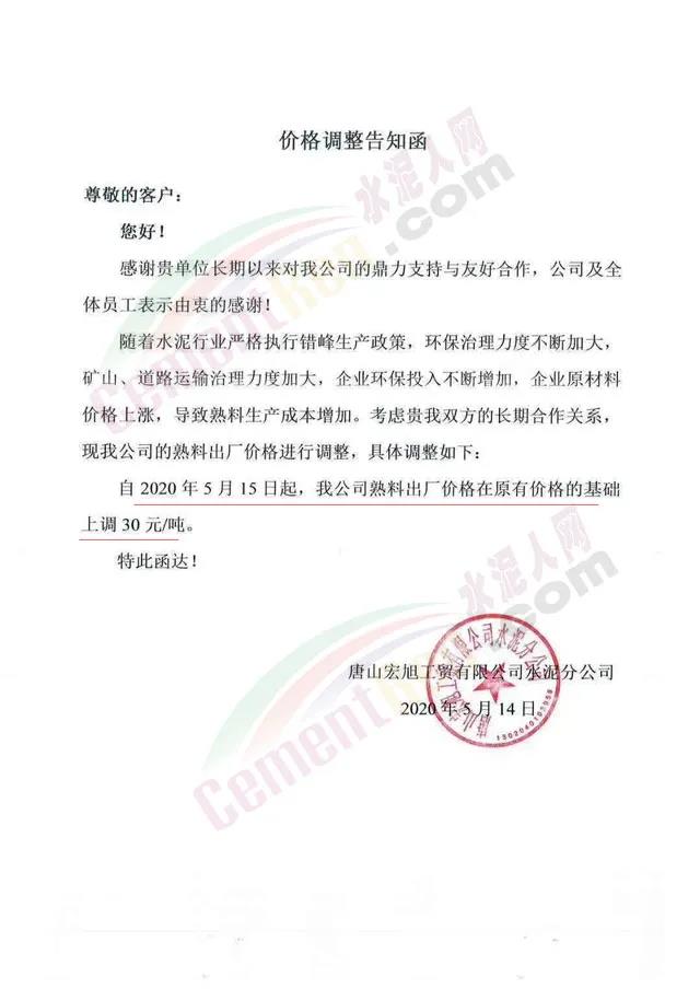 5月14日,唐山宏旭工貿(mào)有限公司水泥分公司發(fā)布通知稱:隨著水泥行業(yè)嚴格執(zhí)行錯峰生產(chǎn)政策,環(huán)保治理力度不斷加大,礦山、道路運輸治理力度加大,企業(yè)環(huán)保投入不斷增加,企業(yè)原材料價格上漲,導致熟料生產(chǎn)成本增加。自2020年5月15日起,水泥出廠價格在原有價格的基礎上調(diào)30元/噸。