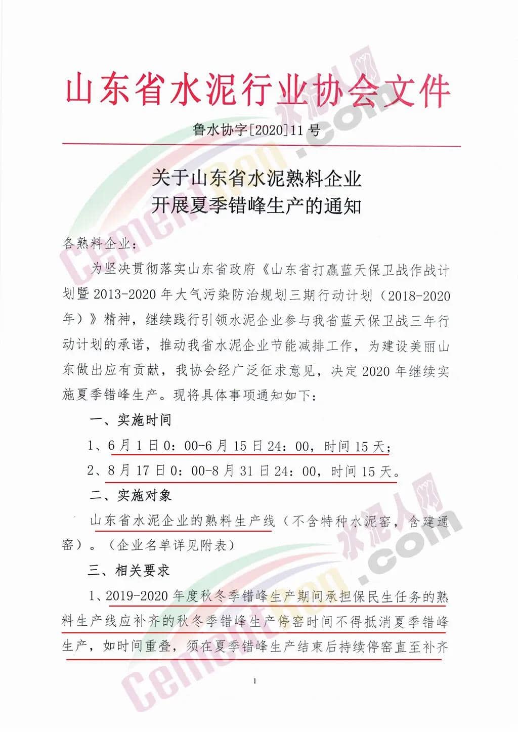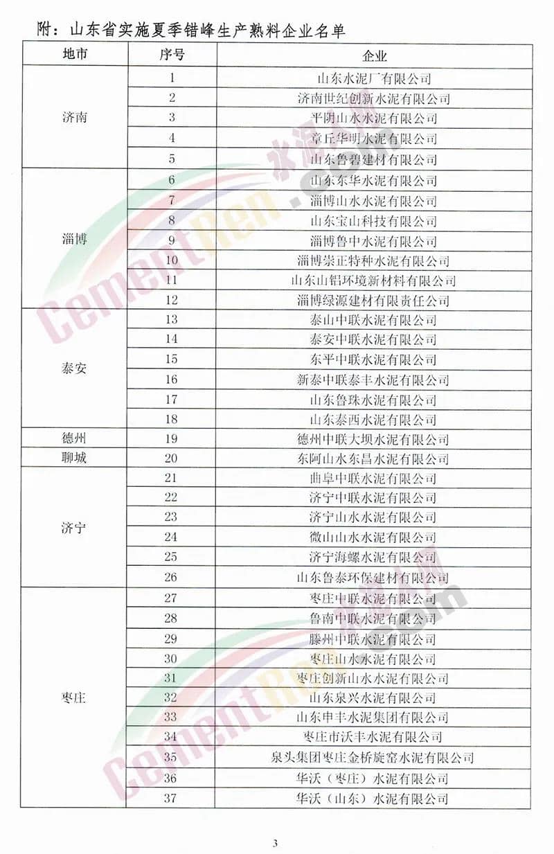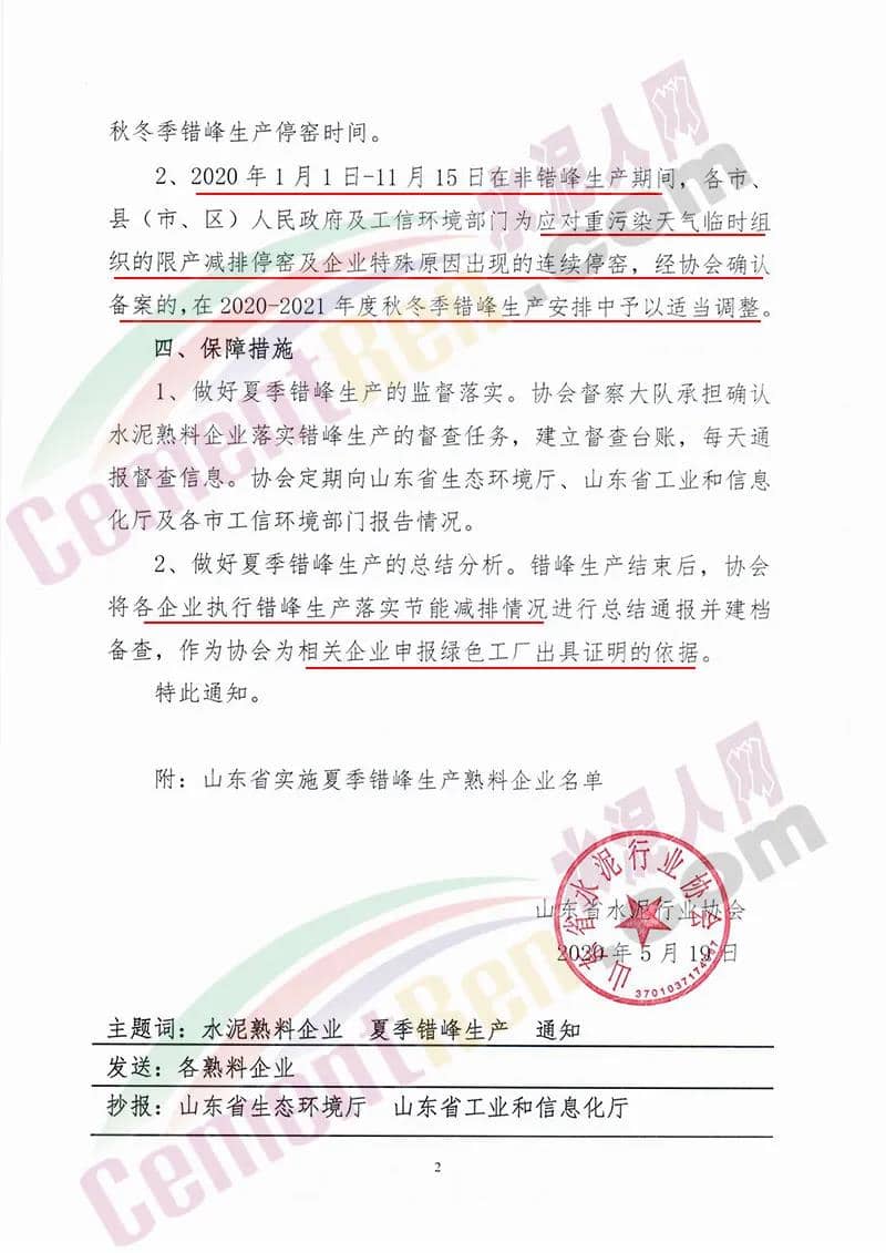 昨日(5月19日)山東省水泥行業(yè)協(xié)會發(fā)布《關(guān)于山東省水泥熟料企業(yè)開展夏季錯(cuò)峰生產(chǎn)的通知》要求山東省水泥企業(yè)的熟料生產(chǎn)線(不含特種水泥窯)2020年繼續(xù)實(shí)施夏季錯(cuò)峰生產(chǎn)。