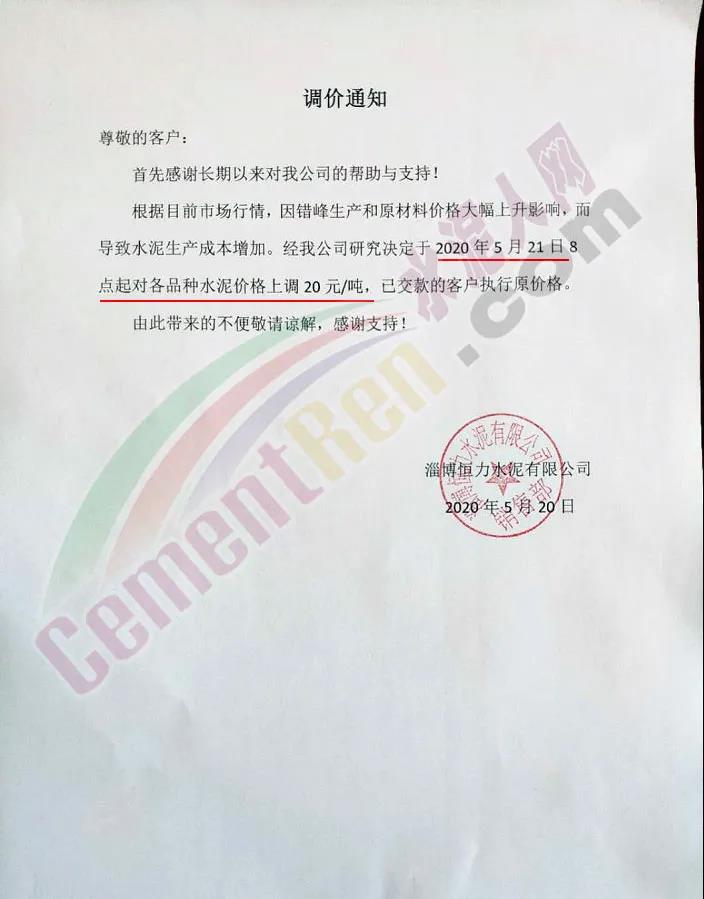 水泥人網(wǎng)通訊員消息:昨日(20日)淄博恒力水泥有限公司通知,根據(jù)目前市場(chǎng)行情,因錯(cuò)峰生產(chǎn)和原材料價(jià)格大幅上升影響,導(dǎo)致水泥生產(chǎn)成本增加。經(jīng)公司研究決定于今日(5月21日)8時(shí)起對(duì)各品種水泥價(jià)格上調(diào)20元/噸。