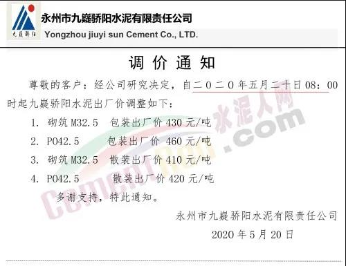 據(jù)水泥人網(wǎng)了解,近兩日,湖南區(qū)域多家企業(yè)也有通知上調(diào)水泥價(jià)格,20日湖南永州市九嶷驕陽(yáng)水泥有限責(zé)任公司通知自5月20日8時(shí)起調(diào)整出廠價(jià)格。調(diào)整后各標(biāo)號(hào)水泥出廠價(jià)如下: