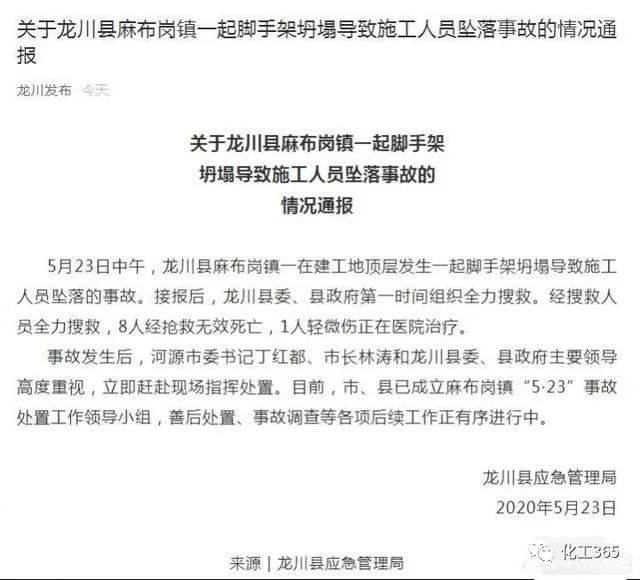 5月23日中午,龍川縣麻布崗鎮(zhèn)一在建工地頂層發(fā)生一起腳手架坍塌導(dǎo)致施工人員墜落的事故。接報(bào)后,龍川縣委、縣政府第一時(shí)間組織全力搜救。經(jīng)搜救人員全力搜救,8人經(jīng)搶救無效死亡,1人輕微傷正在醫(yī)院治療。事故發(fā)生后,河源市委書記丁紅都、市長林濤和龍川縣委、縣政府主要領(lǐng)導(dǎo)高度重視,立即趕赴現(xiàn)場(chǎng)指揮處置。目前,市、縣已成立麻布崗鎮(zhèn)“5·23”事故處置工作領(lǐng)導(dǎo)小組,善后處置、事故調(diào)查等各項(xiàng)后續(xù)工作正有序進(jìn)行中。