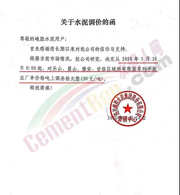 四川峨勝水泥通知自5月26日0時(shí)起,對樂山、眉山、雅安、甘洛區(qū)域所有散裝系列水泥出廠單價(jià)每噸上調(diào)30元/噸。