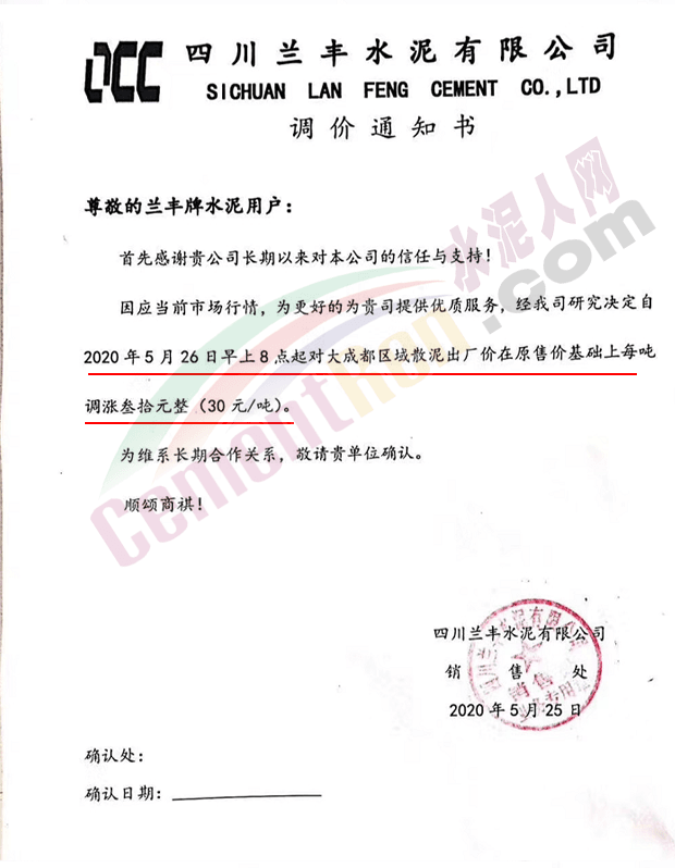 四川蘭豐水泥有限公司通知,自5月26日早8時(shí)起對大成都區(qū)域散裝水泥出廠價(jià)在原售價(jià)基礎(chǔ)上每噸上調(diào)30元。