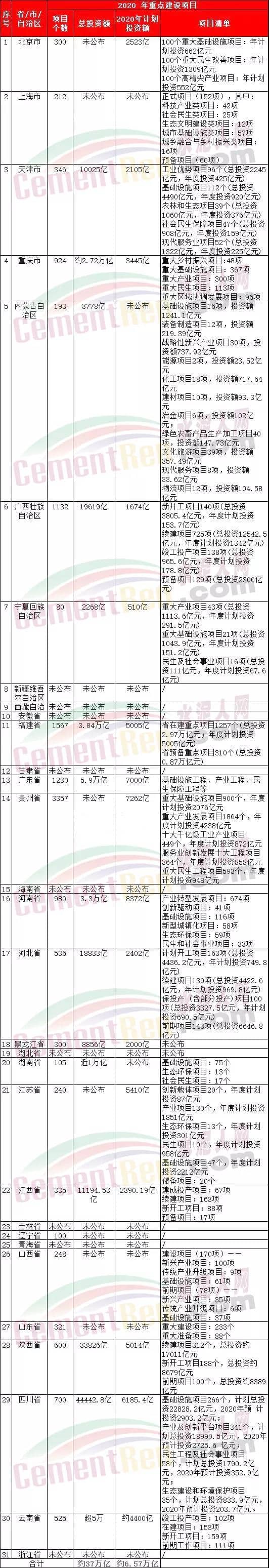近日全國(guó)31個(gè)省、市、自治區(qū)發(fā)布了2020年計(jì)劃完成投資額規(guī)模達(dá)66958億元,其中,新基建預(yù)計(jì)投資額達(dá)15631億元,約占2020年投資額的23%。相關(guān)分析人士預(yù)計(jì)新基建7大領(lǐng)域合計(jì)投資規(guī)模在2020年能夠達(dá)到2萬億-2.45萬億。其中納入基建部分,拉動(dòng)基建增速1.1%-2.6%。而根據(jù)各省市公布的未來幾年實(shí)施的新基建,高達(dá)37萬億。2020年各省市自治區(qū)重點(diǎn)建設(shè)項(xiàng)目如下: