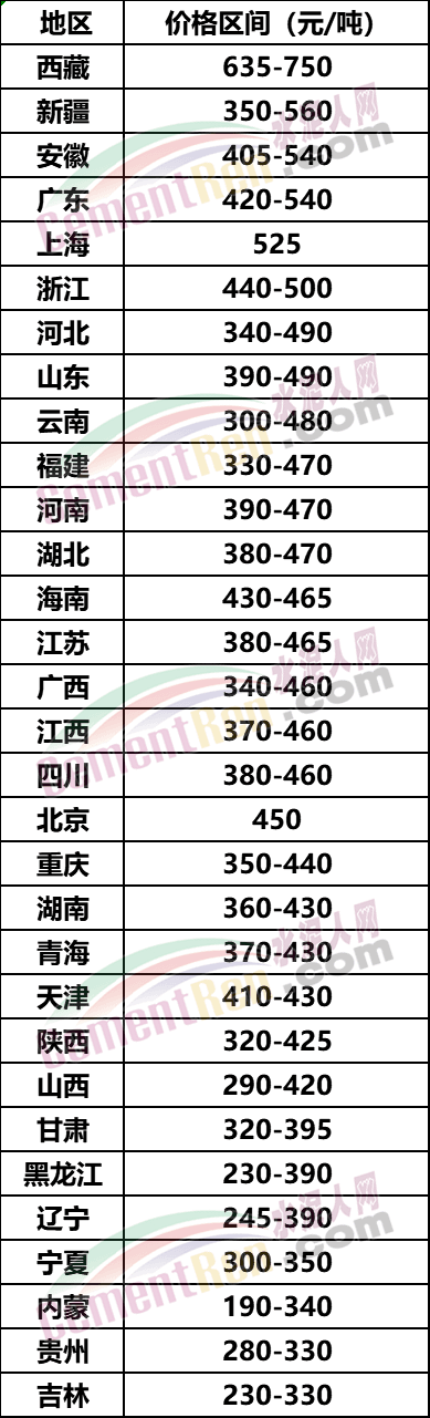 全國(guó)32個(gè)省市PO42.5散裝水泥價(jià)格一覽