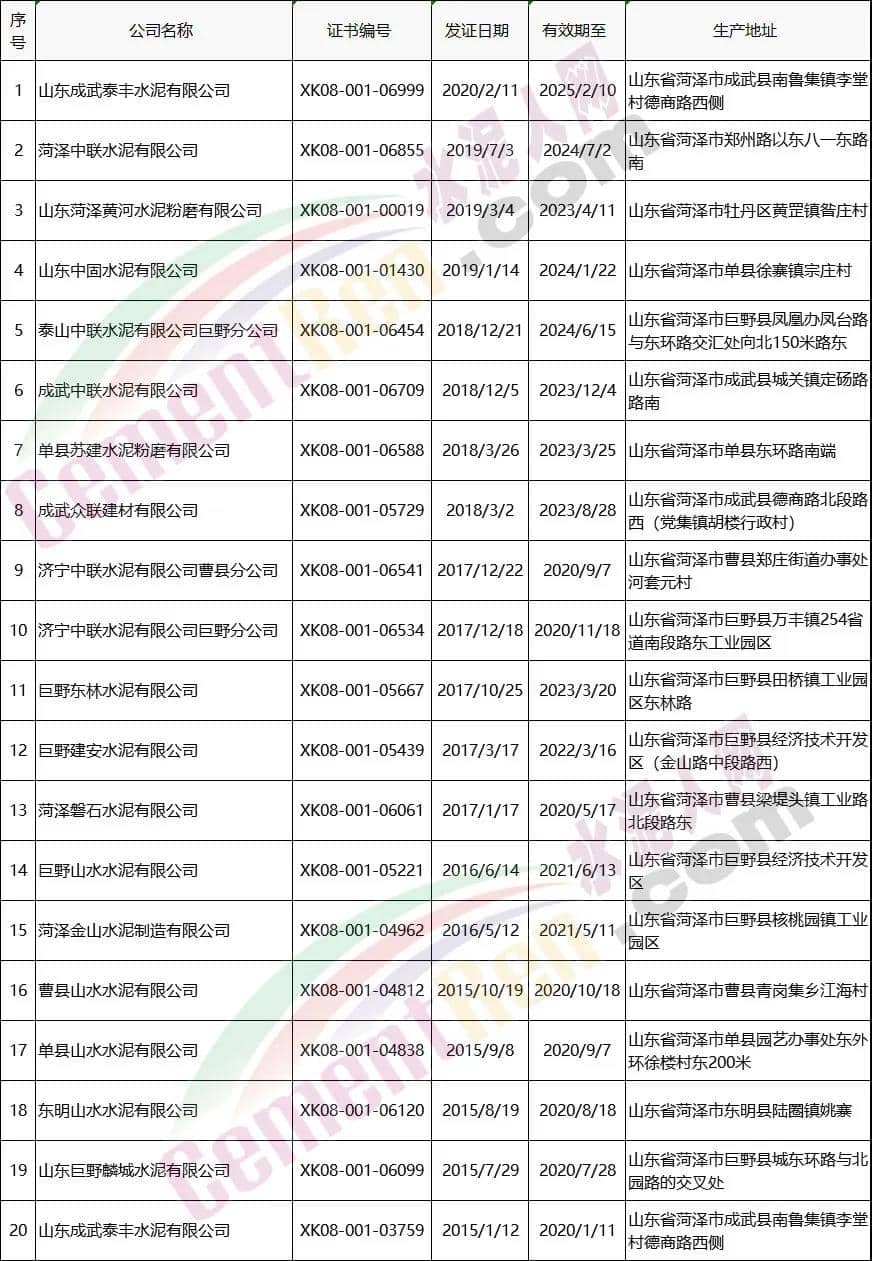 2020年菏澤市獲證水泥生產(chǎn)企業(yè)名單查詢?nèi)掌冢?020年5月26日