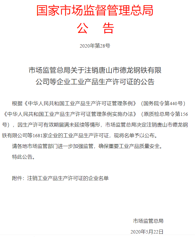 日前,國家市場監(jiān)督管理總局發(fā)布《關于注銷唐山市德龍鋼鐵有限公司等企業(yè)工業(yè)產(chǎn)品生產(chǎn)許可證的公告》(2020年第28號)稱:因生產(chǎn)許可有效期屆滿未延續(xù)等情形,市場監(jiān)管總局決定注銷唐山市德龍鋼鐵有限公司等1681家企業(yè)的工業(yè)產(chǎn)品生產(chǎn)許可證,其中注銷水泥產(chǎn)品生產(chǎn)許可證共106個編號。