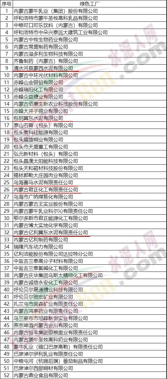 2020年內(nèi)蒙古自治區(qū)綠色制造示范名單中包括清水河縣蒙西水泥有限公司、包鋼冀東水泥有限公司、烏海賽馬水泥有限責(zé)任公司、內(nèi)蒙古君正化工有限責(zé)任公司、內(nèi)蒙古億利冀東水泥有限責(zé)任公司等五家水泥企業(yè)。