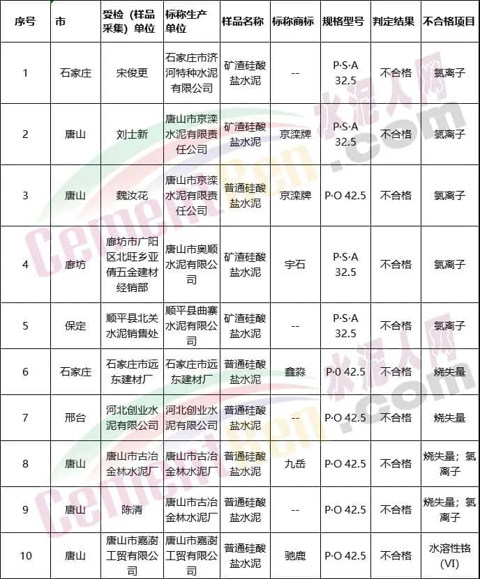 浙江省浙江省市場(chǎng)監(jiān)管局2019年硅酸鹽水泥產(chǎn)品監(jiān)督抽查結(jié)果顯示10個(gè)地區(qū)的49個(gè)批次產(chǎn)品中不合格2批次,不合格項(xiàng)目為氯離子。
