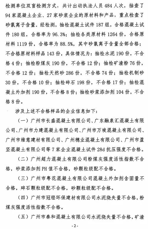 不合格原材料樣品143份,具體情況為:抽檢水泥190份,不合格4份;抽檢粉煤灰190份,不合格12份;抽檢礦渣粉76份,不合格12份;抽檢天然砂286份,不合格74份;抽檢機(jī)制砂30份,不合格10份;抽檢礦石198份,不合格17份;抽檢混凝土外加劑190份,不合格8份;抽檢砂漿添加劑104份,不合格8份。不合格樣品的企業(yè)信息如下: