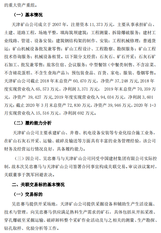 昨日(6月1日)寧夏建材(600449.SH)公布,公司全資子公司吳忠賽馬與天津礦山工程有限公司(以下簡稱“天津礦山公司”)簽署《吳忠賽馬新型建材有限公司紅柳山水泥用石灰?guī)r礦石灰石開采、運輸、加工承包合同》,由天津礦山公司承包吳忠賽馬紅柳山水泥用石灰?guī)r礦石灰石開采、運輸、加工事宜,承包期5年(自2020年6月20日至2025年6月19日),發(fā)生交易總金額不超過1.15億元(其中2020年度發(fā)生交易金額不超過1127萬元,其他年度每年發(fā)生交易金額不超過2600萬元)。