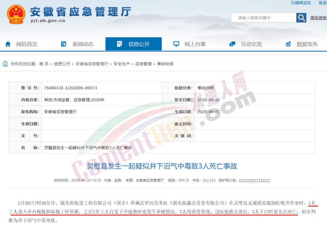 據(jù)安徽省應(yīng)急管理廳網(wǎng)站消息,5月30日,靈璧縣發(fā)生一起疑似井下沼氣中毒致3人死亡事故。5月30日7時(shí)30分許,湖北省航道工程有限公司(國企)所屬岳羅河勞務(wù)隊(duì)(湖北海鑫達(dá)勞務(wù)有限公司)在靈璧縣靈城鎮(zhèn)實(shí)施倒虹吸井作業(yè)時(shí),1名工人進(jìn)入井內(nèi)模板拆除施工時(shí)暈厥,之后2名工人自發(fā)下井搶救時(shí)也發(fā)生暈厥情況,3人均重度昏迷。送醫(yī)搶救無效后,3人于12時(shí)前先后死亡,初步判斷為井下沼氣中毒導(dǎo)致。