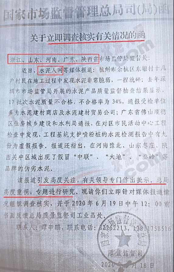 文件稱水泥質(zhì)量問題事關(guān)建筑工程質(zhì)量百年大計,事關(guān)群眾生命財產(chǎn)安全和企業(yè)合法權(quán)益,事關(guān)質(zhì)量強國戰(zhàn)略實話,事關(guān)市場秩序和營商環(huán)境 ,國務(wù)院領(lǐng)導(dǎo)專題做出指示要求嚴(yán)厲查處水泥質(zhì)量問題,省局領(lǐng)導(dǎo)高度重視,要求嚴(yán)格貫徹國務(wù)院領(lǐng)導(dǎo)重要指示精神,嚴(yán)格執(zhí)行聯(lián)合調(diào)查組精神,忠實履職盡責(zé),加強監(jiān)管執(zhí)法劣實工作責(zé)任,限期查處問題,維護(hù)群眾利益和企業(yè)合法權(quán)益,維護(hù)良好市場秩序。