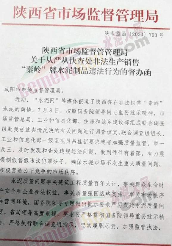 針對聯(lián)合督查組提出的要求,陜西省市場監(jiān)管局于7月10日下發(fā)《關(guān)于從嚴(yán)從快查處非法生產(chǎn)銷售“秦嶺”牌水泥制品違法行為的督辦函》給轄區(qū)咸陽市市場監(jiān)管局要求對轄區(qū)內(nèi)相關(guān)企業(yè)進(jìn)行重點督查。