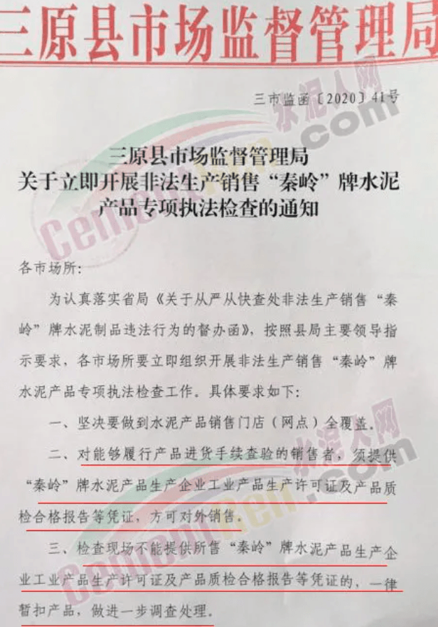 同期,陜西咸陽市三原縣市場監(jiān)督管理局發(fā)布《關(guān)于立即開展非法生產(chǎn)銷售“秦嶺 ”牌水泥產(chǎn)品專項執(zhí)法檢查的通知》稱,為認(rèn)真落實省局《關(guān)于從嚴(yán)從快查處非法生產(chǎn)銷售“秦嶺”牌水泥制品違法行為的督辦函》按照縣局主要領(lǐng)導(dǎo)指示要求,各市場 所要立即組織開展非法生產(chǎn)銷售“秦嶺”牌水泥產(chǎn)品專項執(zhí)法檢查工作。具體要求為: