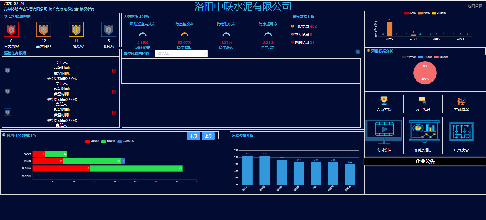洛陽中聯(lián)自建廠以來,高度重視安全工作,先后投入大量的資金和人力,不斷完善公司的安全生產(chǎn)管理體系。2018年7月份以來,隨著《河南省安全生產(chǎn)監(jiān)督管理局關(guān)于開展我省工貿(mào)行業(yè)企業(yè)安全風(fēng)險(xiǎn)評(píng)估診斷分級(jí)的通知》和《河南省企業(yè)風(fēng)險(xiǎn)分級(jí)管控隱患排查治理雙重預(yù)防指導(dǎo)手冊(cè)》兩份文件的先后下發(fā),洛陽中聯(lián)積極響應(yīng)上級(jí)指示精神,開始于2019年3月份,依托公司的智能化平臺(tái),正式著手構(gòu)建洛陽中聯(lián)信息化雙重預(yù)防機(jī)制。