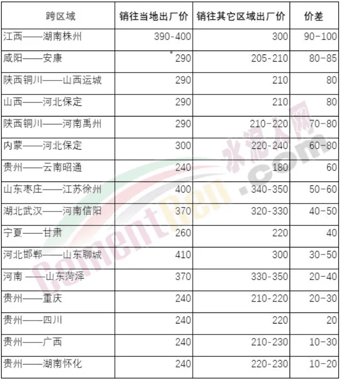 部地區(qū)主流水泥企業(yè)跨區(qū)域及本地出廠報(bào)價(jià)表