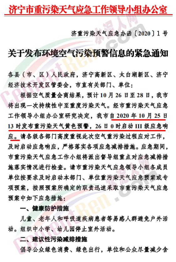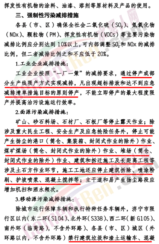 要求工業(yè)企業(yè)按照“一廠(chǎng)一策”的減排要求,通過(guò)停產(chǎn)或部分生產(chǎn)線(xiàn)限產(chǎn)方式實(shí)現(xiàn)減排,凡出現(xiàn)超標(biāo)排放和達(dá)不到應(yīng)急減排清單措施目標(biāo)的原則停產(chǎn),不能立即停產(chǎn)的最大程度限產(chǎn)并提高治污設(shè)施運(yùn)行效率。礦山、砂石料場(chǎng)、石材廠(chǎng)、石板廠(chǎng)等停止露天作業(yè);除涉及重大民生工程、安全生產(chǎn)及應(yīng)急搶險(xiǎn)任務(wù)外,停止可能產(chǎn)生揚(yáng)塵的港口作業(yè)、煤礦煤場(chǎng)作業(yè)、堆場(chǎng)作業(yè)、建筑和拆遷施工及長(zhǎng)距離工程等涉及土石方作業(yè)環(huán)節(jié),施工工地還應(yīng)停止建筑拆除、噴涂粉刷、護(hù)坡噴漿、混凝土攪拌等。除城市運(yùn)行保障車(chē)輛和執(zhí)行特種任務(wù)車(chē)輛外,濟(jì)寧市限行區(qū)以?xún)?nèi)禁行建筑垃圾和渣土運(yùn)輸車(chē)、混凝土罐車(chē)、砂石運(yùn)輸車(chē)等中型和重型載貨汽車(chē)。全市范圍內(nèi)未安裝密閉裝置易產(chǎn)生遺撒的煤炭、渣土、砂石料等運(yùn)輸車(chē)輛應(yīng)停止上路。對(duì)未按國(guó)家、省要求落實(shí)應(yīng)急措施和未納入應(yīng)急減排清單的涉氣企業(yè),重污染應(yīng)急期間實(shí)施停產(chǎn)。通知原文如下: