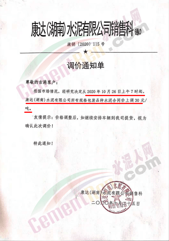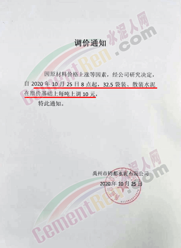 禹州市鈞都水泥通知,因原材料價(jià)格上漲等因素,自10月25日8點(diǎn)起,32.5袋裝、散裝水泥在原價(jià)基礎(chǔ)上每噸上調(diào)10元。
