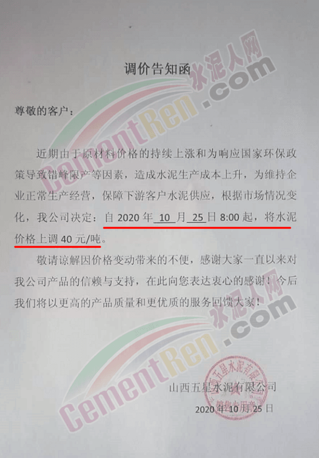 山西五星水泥通知,由于原材料價(jià)格的持續(xù)上漲和為響應(yīng)國(guó)家環(huán)保政策導(dǎo)致錯(cuò)峰限產(chǎn)等因素,造成水泥生產(chǎn)成本上升,為維持企業(yè)正常生產(chǎn)經(jīng)營(yíng),保障下游客戶(hù)水泥供應(yīng),根據(jù)市場(chǎng)情況變化,公司決定自10月25日8時(shí)起將水泥價(jià)格上調(diào)40元/噸。
