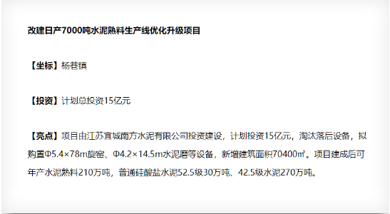 其中,江蘇宜城南方水泥有限公司投資建設(shè)改建日產(chǎn)7000噸水泥熟料生產(chǎn)線優(yōu)化升級項(xiàng)目在列。