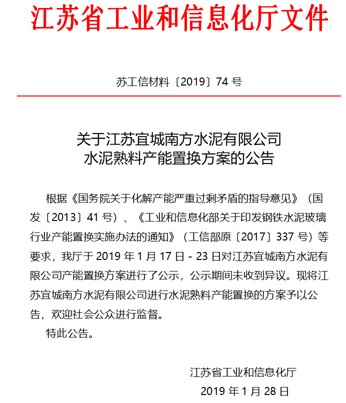 據(jù)水泥人網(wǎng)了解,今年1月末,江蘇工信廳發(fā)布《關(guān)于江蘇宜城南方水泥有限公司水泥熟料產(chǎn)能置換方案的公告》稱根據(jù)相關(guān)文件要求,于2019年1月17日-23日對江蘇宜城南方水泥有限公司產(chǎn)能置換方案進(jìn)行了公示,公示期間未收到異議。并將江蘇宜城南方水泥有限公司進(jìn)行水泥熟料產(chǎn)能置換的方案予以公告。