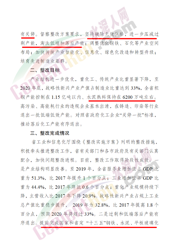 二是過剩和低端落后產(chǎn)能有序退出。提前完成國家和省定 “十三五”鋼鐵、水泥、平板玻璃化解過剩目標任務,并在印染、鑄造、電鍍等行業(yè)實施完成一批低端低效產(chǎn)能退出項目。至2019年底,全省粗鋼產(chǎn)能和水泥熟料產(chǎn)能控制在預期目標之內(nèi)。