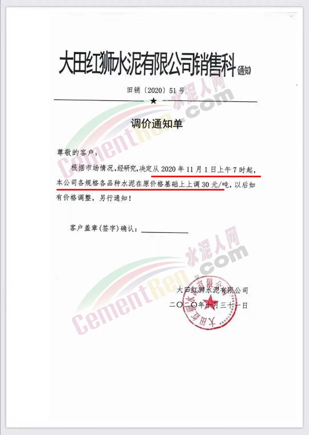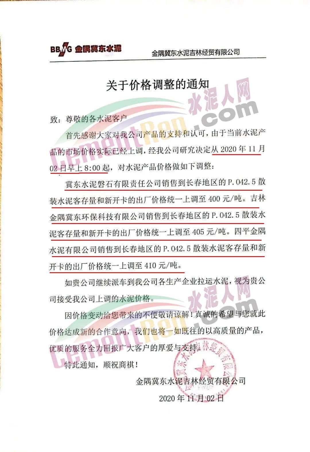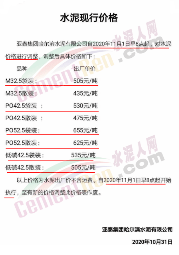 黑龍江賓州水泥有限公司也通知11月1日8時(shí)起上調(diào)水泥價(jià)格,漲價(jià)后M32.5袋裝水泥執(zhí)行445元/噸,PO42.5水泥執(zhí)行485元/噸,M32.5散裝水泥執(zhí)行425元/噸,PO42.5散裝執(zhí)行465元/噸。