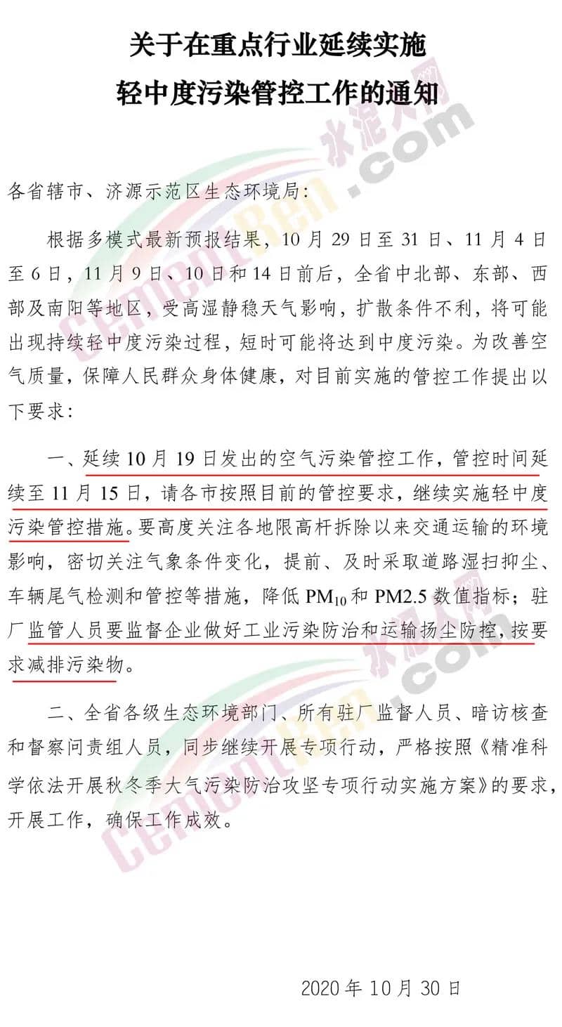 新鄉(xiāng)市環(huán)境污染防治攻堅指揮部辦公室發(fā)布《關于延續(xù)實施輕中度污染管控的通知》稱,根據(jù)省廳《關于在重點行業(yè)延續(xù)實施輕中度污染管控工作的 通知》有關要求,于10月30日24時至11月15日24時延續(xù)實施輕中度污染管控。