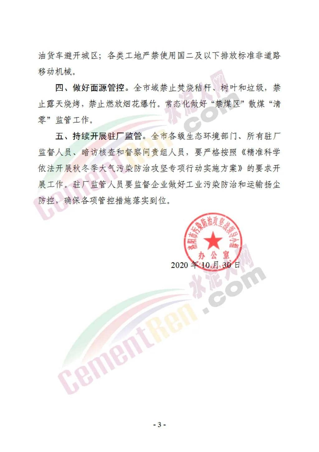 嚴格落實企業(yè)管控要求,水泥熟料、碳素、玻璃制品和陶瓷企業(yè)限產(chǎn)50%(含)以上(以生產(chǎn)線計,兩條生產(chǎn)線的停產(chǎn)一條,單條生產(chǎn)線的停產(chǎn));水泥粉磨站及水泥制品、石灰窯、礦粉、鈣粉、商砕和瀝青攪拌站等所有建材行業(yè)全部停產(chǎn)(績效引領性企業(yè)除外);所有企業(yè)停止使用國四及以下重型載貨車輛(含燃氣)進行運輸。通知原文如下:
