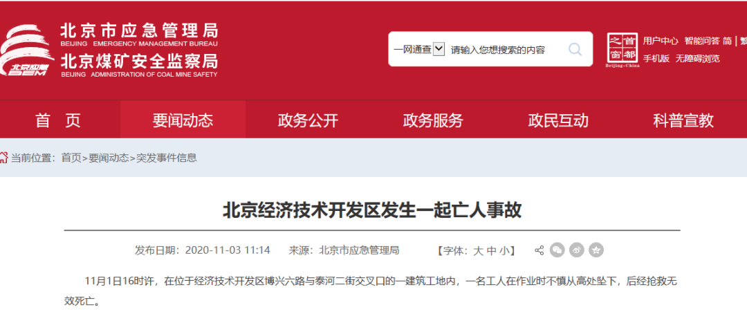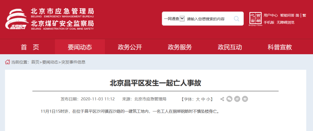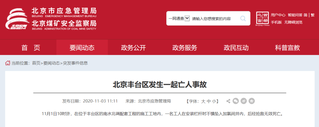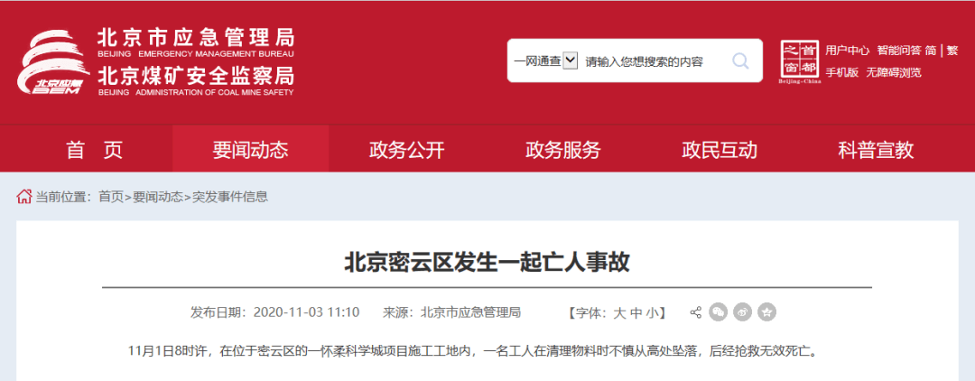 北京市管理局官網公布的突發(fā)事件信息顯示,11月1日共有4起事故,其中3起涉及建筑施工項目,均為高處墜落事故,導致3名工人死亡。另一起為南水北調配套工程的施工工地內,一名工人在安裝欄桿時不慎墜入加氯間井內,后經搶救無效死亡。11月1日8時許,在位于密云區(qū)的一懷柔科學城項目施工工地內,一名工人在清理物料時不慎從高處墜落,后經搶救無效死亡。