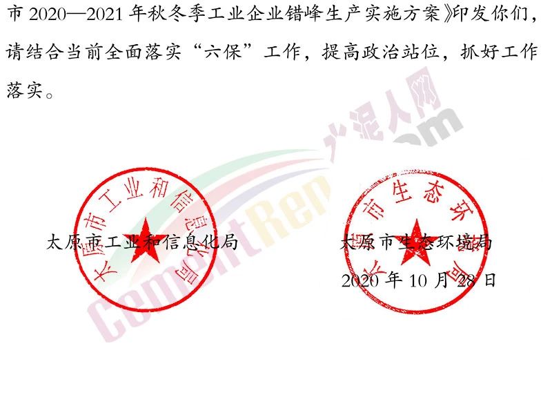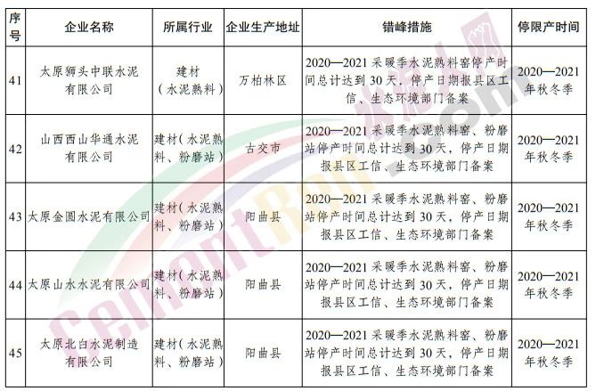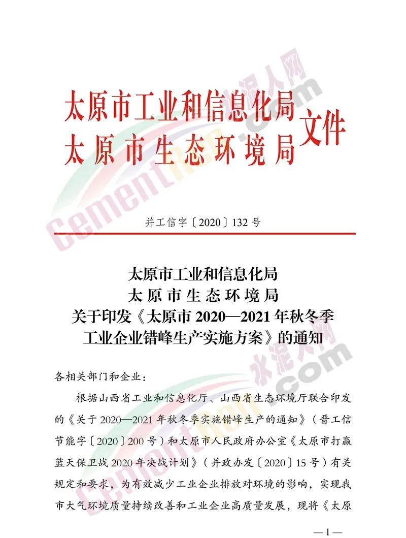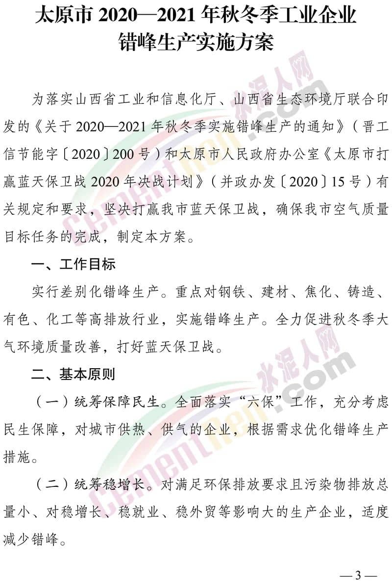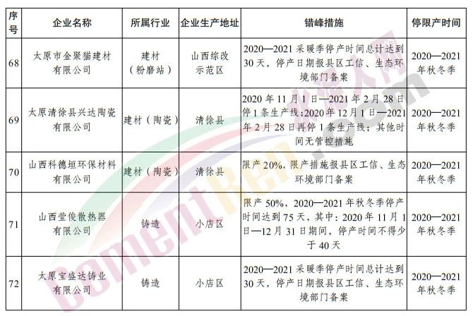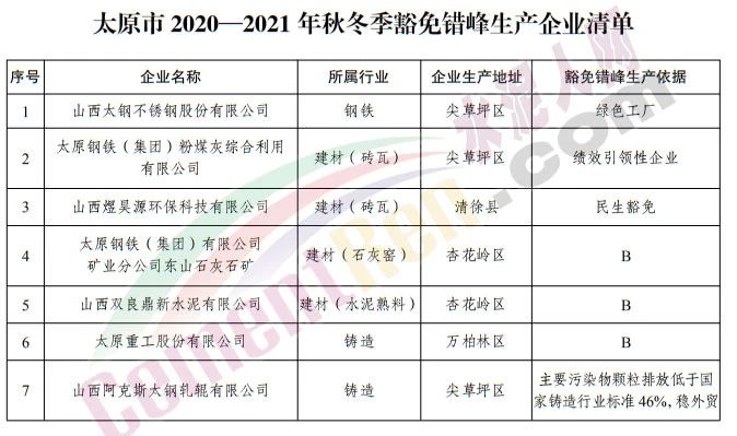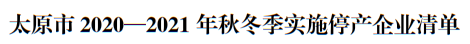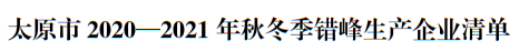 太原市 2020—2021 年秋冬季工業(yè)企業(yè)錯(cuò)峰生產(chǎn)實(shí)施方案提到,依據(jù)有關(guān)規(guī)定和要求,堅(jiān)決打贏太原市藍(lán)天保衛(wèi)戰(zhàn),確??諝赓|(zhì)量目標(biāo)任務(wù)的完成。從2020 年 11 月 1 日至 2021 年 3 月 31 日重點(diǎn)對(duì)鋼鐵、建材、焦化、鑄造、 有色、化工等高排放行業(yè),實(shí)施錯(cuò)峰生產(chǎn)。
