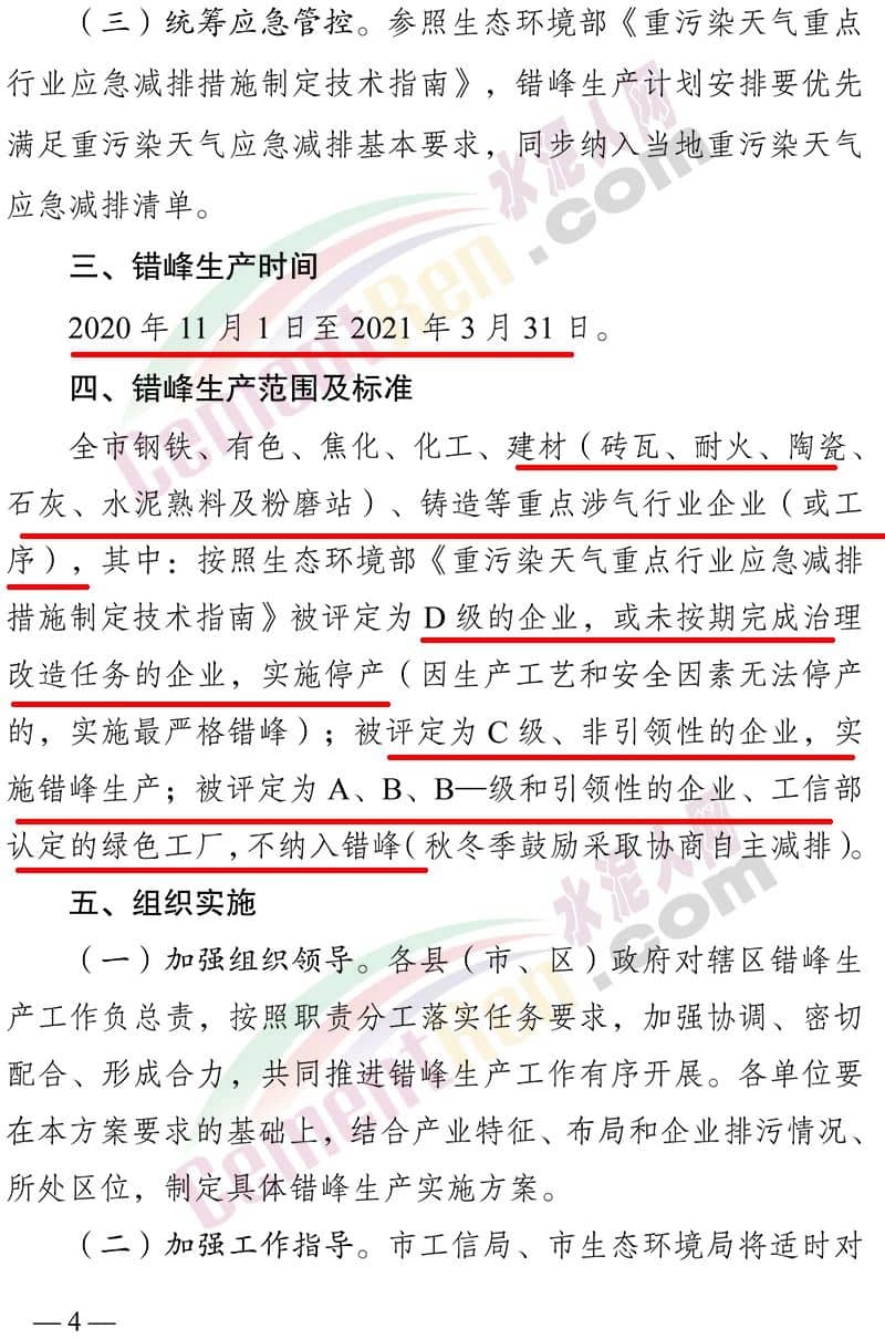 錯(cuò)峰生產(chǎn)范圍及標(biāo)準(zhǔn)全市鋼鐵、有色、焦化、化工、建材(磚瓦、耐火、陶瓷、 石灰、水泥熟料及粉磨站)、鑄造等重點(diǎn)涉氣行業(yè)企業(yè)(或工序),其中:按照生態(tài)環(huán)境部《重污染天氣重點(diǎn)行業(yè)應(yīng)急減排措施制定技術(shù)指南》被評(píng)定為 D 級(jí)的企業(yè),或未按期完成治理改造任務(wù)的企業(yè),實(shí)施停產(chǎn)(因生產(chǎn)工藝和安全因素?zé)o法停產(chǎn)的,實(shí)施最嚴(yán)格錯(cuò)峰);被評(píng)定為 C 級(jí)、非引領(lǐng)性的企業(yè),實(shí)施錯(cuò)峰生產(chǎn);被評(píng)定為A、B、B—級(jí)和引領(lǐng)性的企業(yè)、工信部認(rèn)定的綠色工廠,不納入錯(cuò)峰(秋冬季鼓勵(lì)采取協(xié)商自主減排)。