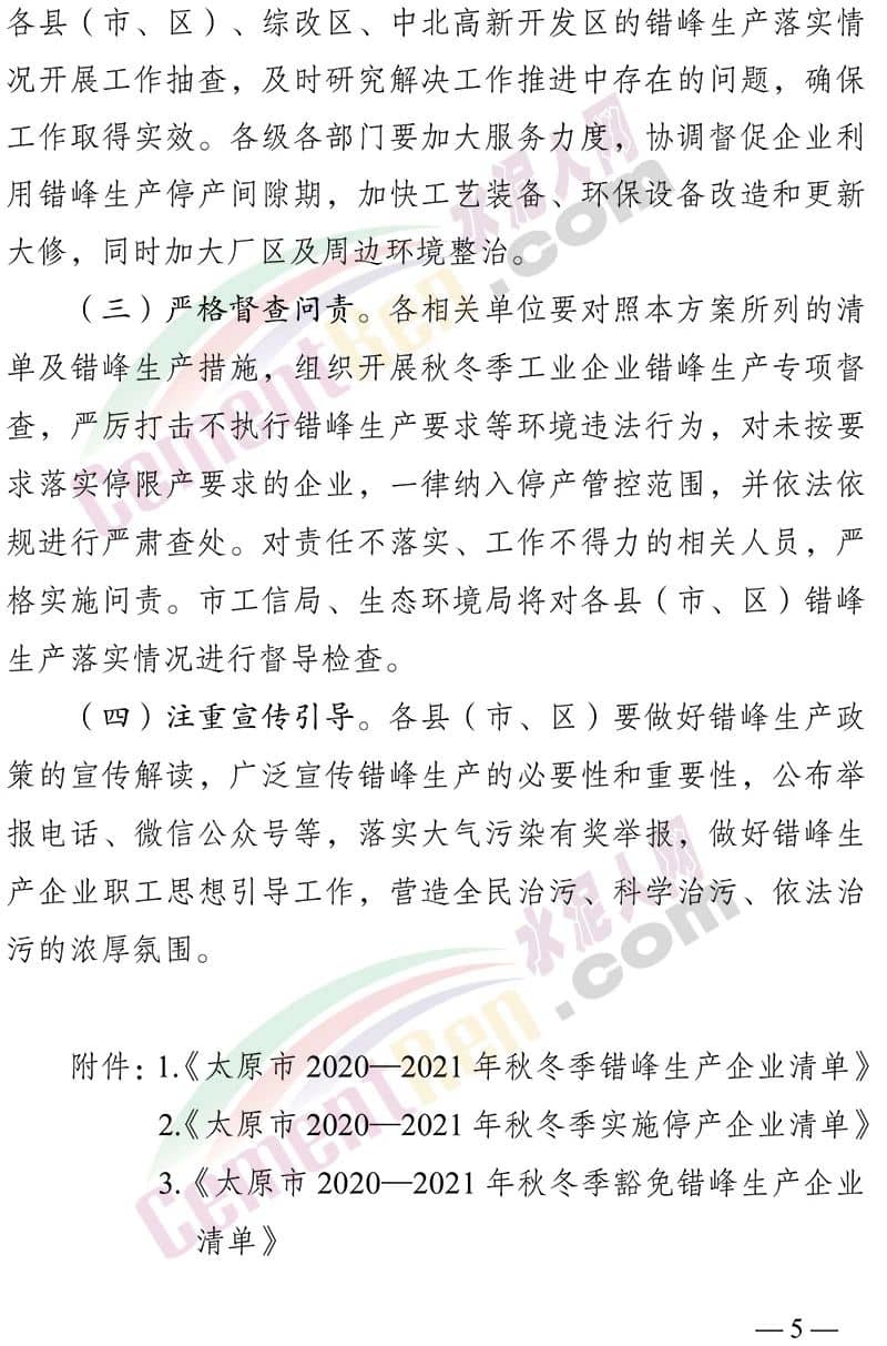 各相關(guān)單位要對(duì)照本方案所列的清 單及錯(cuò)峰生產(chǎn)措施,組織開展秋冬季工業(yè)企業(yè)錯(cuò)峰生產(chǎn)專項(xiàng)督查,嚴(yán)厲打擊不執(zhí)行錯(cuò)峰生產(chǎn)要求等環(huán)境違法行為,對(duì)未按要求落實(shí)停限產(chǎn)要求的企業(yè),一律納入停產(chǎn)管控范圍,并依法依規(guī)進(jìn)行嚴(yán)肅查處。對(duì)責(zé)任不落實(shí)、工作不得力的相關(guān)人員,嚴(yán)格實(shí)施問(wèn)責(zé)。市工信局、生態(tài)環(huán)境局將對(duì)各縣(市、區(qū))錯(cuò)峰生產(chǎn)落實(shí)情況進(jìn)行督導(dǎo)檢查。文件原文如下: