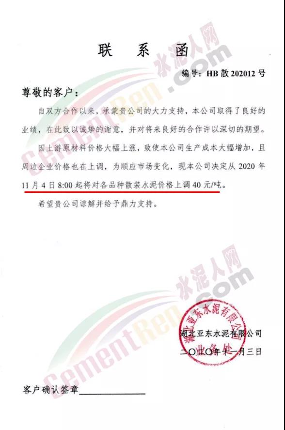 同期,湖北亞?wèn)|水泥通知,因上游原材料價(jià)格大幅上漲,致使公司成本大幅增加,且周邊企業(yè)價(jià)格也在上調(diào),為順應(yīng)市場(chǎng)變化,公司決定從11月4日早8時(shí)起上調(diào)各品種散裝水泥價(jià)格40元/噸。