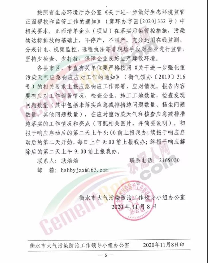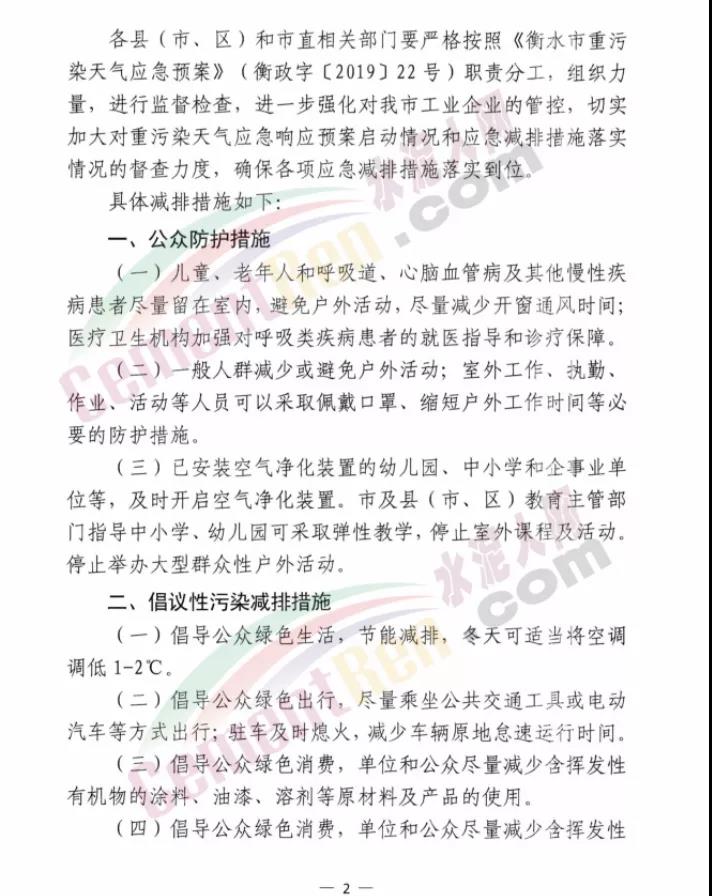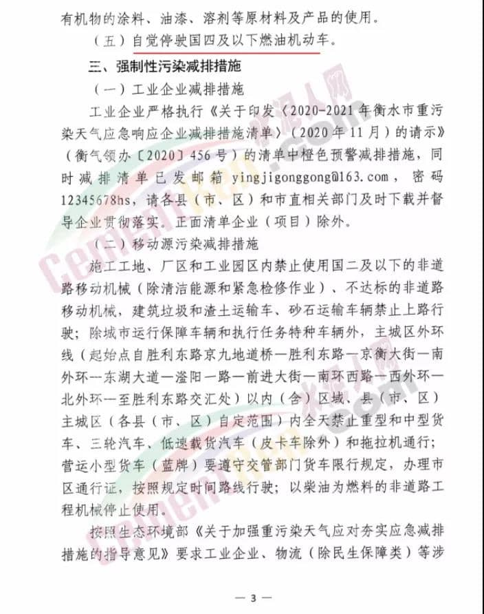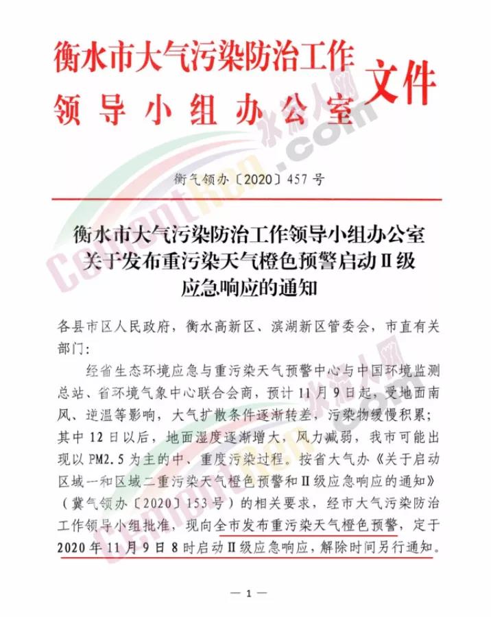 衡水市大氣污染防治工作領(lǐng)導(dǎo)小組辦公室發(fā)文:定于2020年11月9日8時(shí)啟動Ⅱ級應(yīng)急響應(yīng),解除時(shí)間另行通知。工業(yè)企業(yè)嚴(yán)格按照《2020-2021年衡水市工業(yè)企業(yè)應(yīng)急減排清單(報(bào)審版)》的清單中橙色預(yù)警減排措施執(zhí)行。除應(yīng)急搶險(xiǎn)外,建成區(qū)停止所有施工工地的土石方作業(yè)(包括:停止土石方開挖、回填、場內(nèi)倒運(yùn)、摻拌石灰、混凝土剔鑿、改造、建筑工程配套道路和管溝開挖等作業(yè))、建筑拆除、噴涂粉刷、護(hù)坡噴漿、混凝土攪拌等。