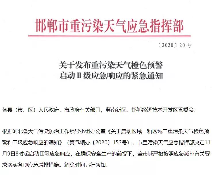 邯鄲市重污染天氣應(yīng)急指揮部通知,于11月9日8時(shí)起啟動Ⅱ級應(yīng)急響應(yīng),在確保安全生產(chǎn)的前提下,全市域嚴(yán)格按照應(yīng)急減排有關(guān)要求落實(shí)各項(xiàng)應(yīng)急減排措施。工業(yè)企業(yè)合理調(diào)控生產(chǎn)計(jì)劃,在確保安全生產(chǎn)和民生保障的前提下,按照《邯鄲市2020-2021年重污染天氣應(yīng)急減排工業(yè)源清單(修訂版)》橙色預(yù)警(Ⅱ級)差異化減排措施執(zhí)行到位。