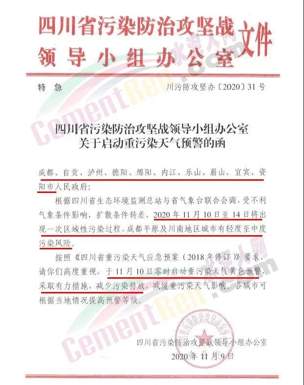 日前,水泥人網(wǎng)從四川省污染防治攻堅(jiān)戰(zhàn)領(lǐng)導(dǎo)小組辦公室獲悉,11月10日零時(shí),成都、自貢、瀘州、德陽、綿陽、內(nèi)江、樂山、眉山、宜賓、資陽10市將啟動(dòng)重污染天氣黃色預(yù)警。根據(jù)四川省生態(tài)環(huán)境監(jiān)測總站與省氣象臺(tái)聯(lián)合會(huì)商,受不利氣象條件影響,擴(kuò)散條件轉(zhuǎn)差,2020年11月10日至14日將出現(xiàn)一次區(qū)域性污染過程,成都平原及川南地區(qū)城市有輕度至中度污染風(fēng)險(xiǎn)。按照《四川省重污染天氣應(yīng)急預(yù)案(2018年修訂)》要求,成都、自貢、瀘州、德陽、綿陽、內(nèi)江、樂山、眉山、宜賓、資陽應(yīng)于11月10日零時(shí)啟動(dòng)重污染天氣黃色預(yù)警,采取有力措施,減少污染排放,減緩重污染天氣影響。各城市可根據(jù)當(dāng)?shù)厍闆r提高預(yù)警等級。