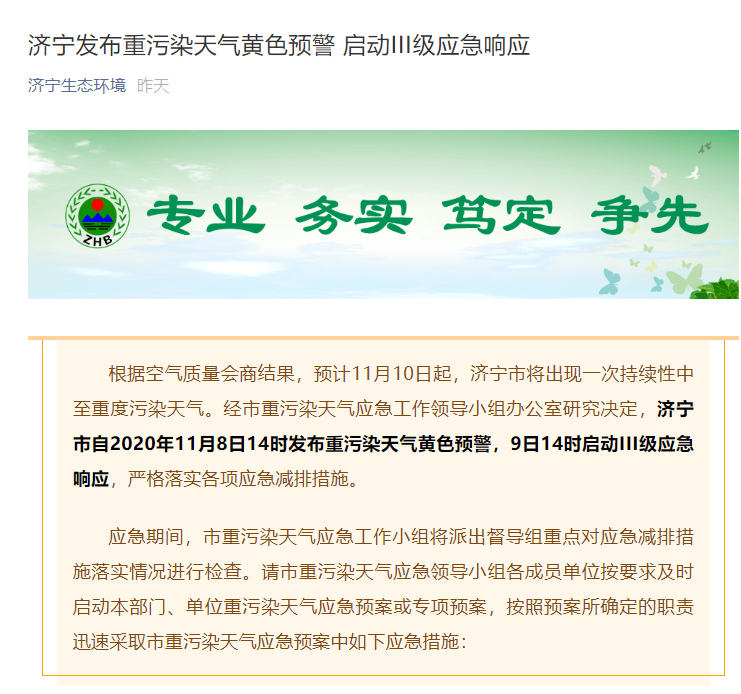 根據(jù)空氣質(zhì)量會商結(jié)果,預(yù)計11月10日起,濟寧市將出現(xiàn)一次持續(xù)性中至重度污染天氣。經(jīng)市重污染天氣應(yīng)急工作領(lǐng)導(dǎo)小組辦公室研究決定,濟寧市自2020年11月8日14時發(fā)布重污染天氣黃色預(yù)警,2020年11月9日14時啟動III級應(yīng)急響應(yīng),嚴格落實各項應(yīng)急減排措施。
