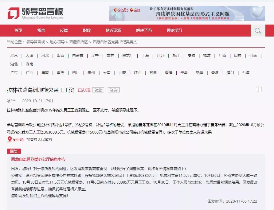 西藏自治區(qū)黨委辦公廳信息中心回復稱:“網友,您好!對于您所反映的問題,區(qū)發(fā)展改革委高度重視,及時進行了調查核實,現將有關情況答復如下:經核實,葛洲壩集團股份有限公司拉林鐵路工程指揮部確認拖欠您民工工資36.30885萬元、機械租賃費11.5萬元屬實。10月26日,經雙方協(xié)商達成一致意見,10月30日支付您11.5萬元機械租賃費,11月6日前支付36.30885萬元民工工資。10月30日,工作人員與您核實,您同意目前調處結果。區(qū)發(fā)展改革委將繼續(xù)跟蹤進展,確保妥善處理相關事宜。感謝網友對我們工作的理解與支持!”