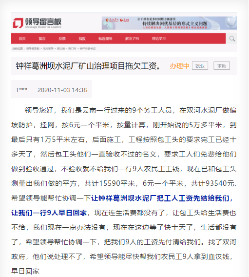 葛洲壩拖欠工資并非個例,11月3日,另一網友在人民網《領導留言板》留言稱,云南來的一行9人,在雙河水泥廠做偏坡防護,掛網,按6元一個平米,按量計算,剛開始說的5萬多平米,到最后只有1萬5平米左右,后面施工,工程按照包工頭的要求完工已經十多天了,然后包工頭他們一直驗收不過的名義,要求工人們免費給他們做到驗收通過,不驗收就不給農民工工錢,現在已和包工頭測量出共計15590平米,6元一個平米,共計93540元。希望領導能幫忙協(xié)調一下讓鐘祥葛洲壩水泥廠把工人工資先結給大家,讓9名工人早日回家。工人現在連生活費都沒有了。已經等了快十天了,希望領導幫忙協(xié)調一下,把9名工人的工資先付清。已經找過雙河政府,他們說處理不了,希望領導能盡快幫農民工拿到血漢錢。